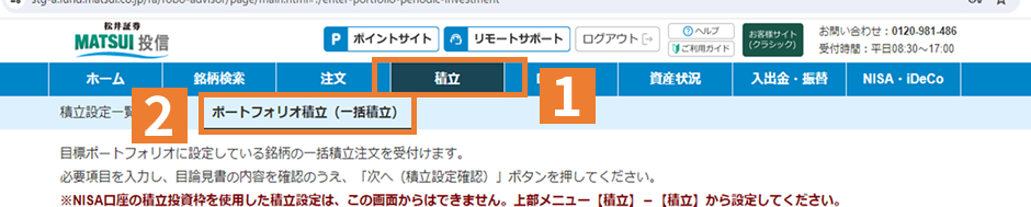 - 【2】「ポートフォリオ積立(一括積立)」を押す。