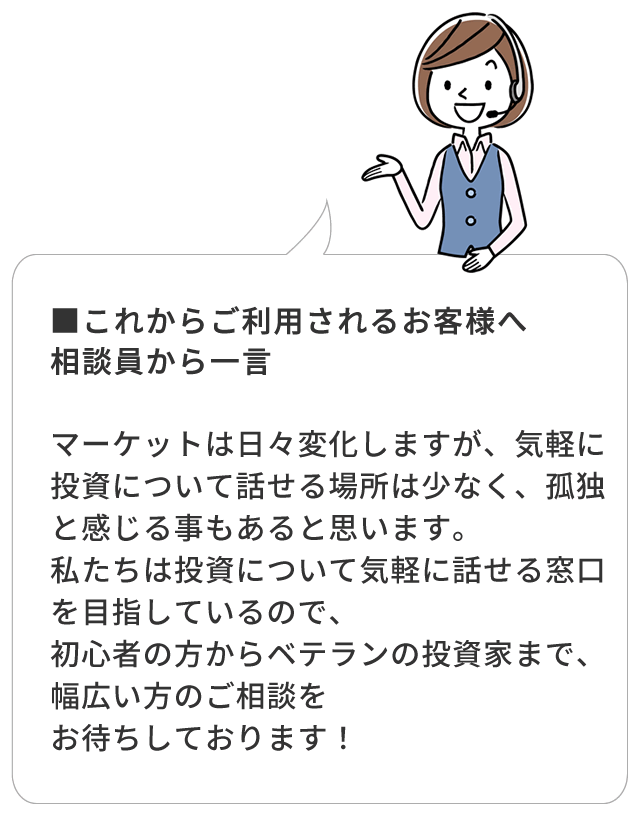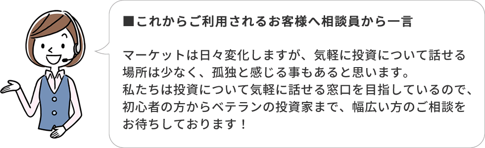 株式市場やマクロ環境を元に「銘柄の探し方」「個別銘柄の材料探し・見通し」「取引タイミング」の投資判断に関わる専門的な内容について、投資相談専門の相談員が対応しています。