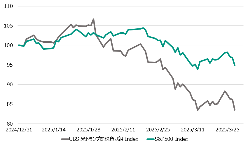 投資銀行のUBSが監修した、Trump Tariff Losersと名付けられた「トランプ関税負け組バスケット(上場企業38社で構成されたインデックス)」がありますので確認してみましょう。