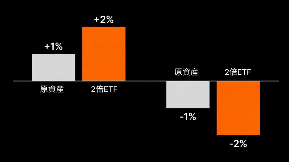 レバレッジETFは、テスラやエヌビディアといった特定の株式や株価指数などの原資産の1日のパフォーマンスを、決められた倍率で連動するよう設計された上場投資信託(ETF)です。例えば、原資産が1日に1%上昇すると、2倍(2x)レバレッジETFは約2%上昇し、逆に1%下落するとETFは約2%下落します。つまり、利益も損失も倍率分だけ拡大されるという点が核心です。